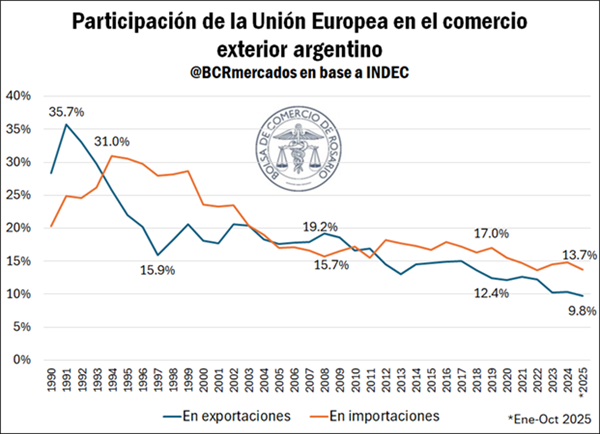 Según datos de la Bolsa de Comercio de Rosario (BCR), en lo que va del 2025 la participación de la Unión Europea en el comercio externo argentino toca su piso histórico.