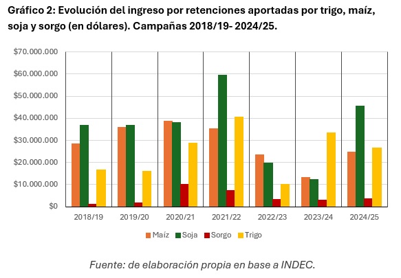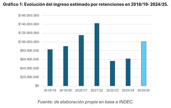 Obviamente la situación ha ido cambiando año a año ya que cambiaron no solo los volúmenes cosechados en la provincia, sino también los precios de los granos y la alícuota aplicada de retenciones. “Los resultados muestran que el máximo de aportes se registró durante la campaña 2021/22, con un ingreso fiscal cercano a 143 millones de dólares, impulsado por precios internacionales en alza y elevados volúmenes exportados”, indicó el trabajo.