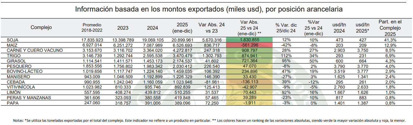 El maíz es el único rubro que presentó un desempeño negativo marcado con rojo en las planillas del CAA, ya que sus exportaciones retrocedieron un 8% internanual, para ubicarse cerca de 6.500 millones de dólares.