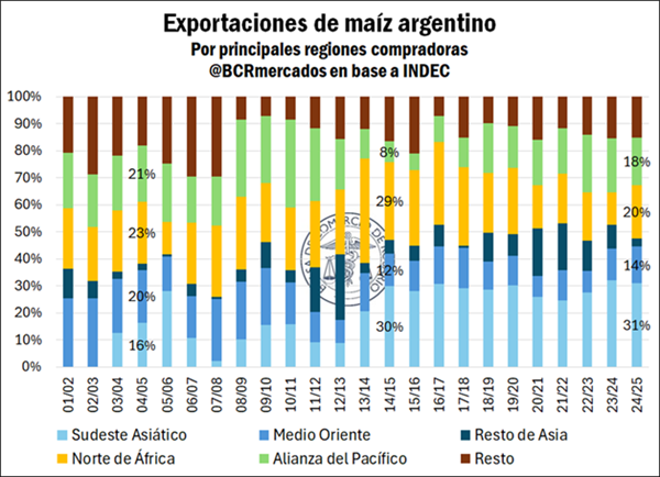 En total la Argentina, en base a datos del INDEC, exportó maíz por 7.158 millones de dólares la campaña anterior. Marcando una tendencia clara, Asia se consolida como principal destino “comprando cerca de la mitad del maíz exportado por la Argentina todos los años”.