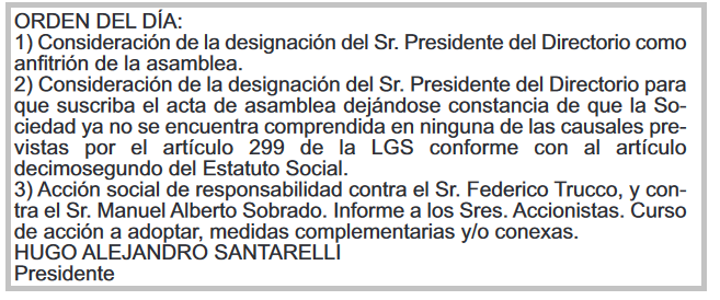 Finalmente, un grupo de accionistas de Bioceres S.A., frente a la sorpresiva debacle que registró la compañía en el último año –que derivó en una cesación de pagos– decidió evaluar la instrumentación de una “acción social de responsabilidad” contra Federico Trucco y Manuel Alberto Sobrado.