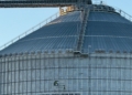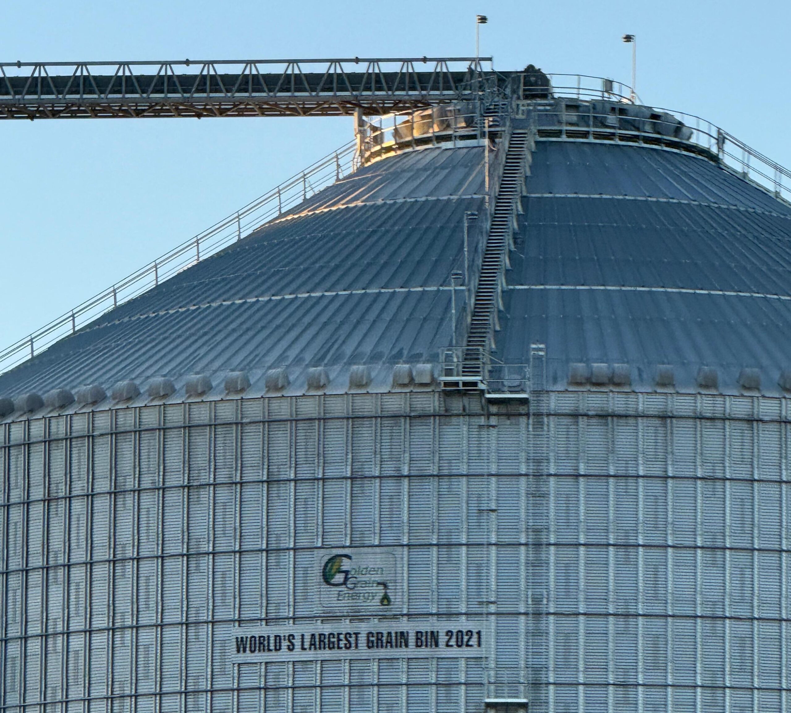 -Si, está en Mason City, Iowa. Tiene la capacidad de un buque. Tiene una capacidad de 55.000 toneladas, un diámetro de 50 metros y se necesitarían alrededor de 2500 camiones para llenarlo. Es de Golden Grain Energy, una empresa que hace bioetanol, y eso le dura 30 días. Cuando lo ves, es tremendo. (N de la R: en internet dice que en interior podría almacenar un avión Boeing 767).