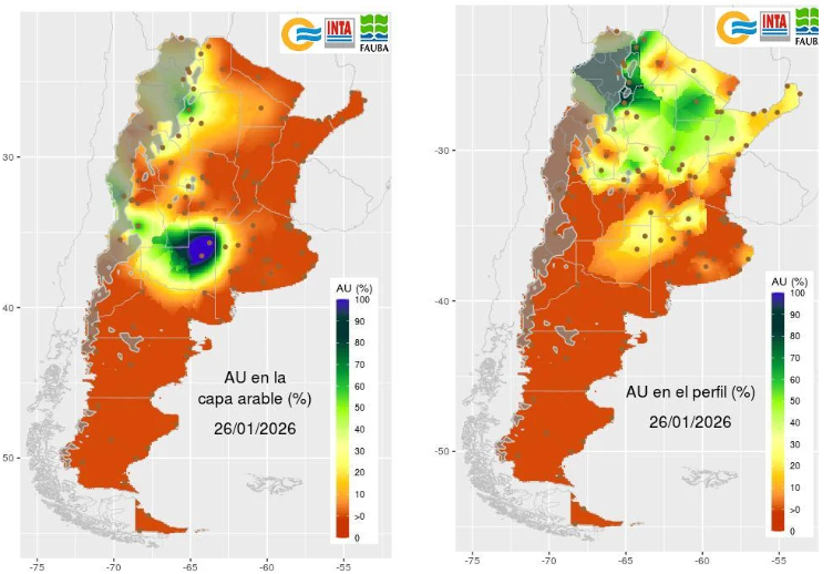 Las proyecciones para los últimos días de enero y los primeros de febrero tampoco muestran probabilidad de ocurrencia de aportes importantes de agua en las regiones con déficits hídricos que son esenciales para el volumen final de la cosecha gruesa argentina.