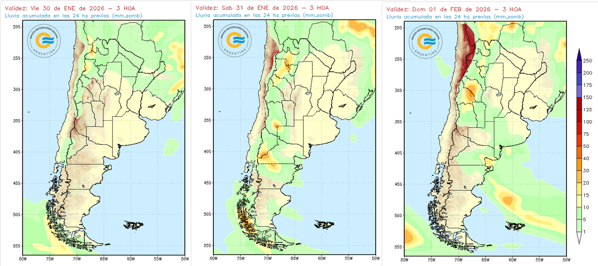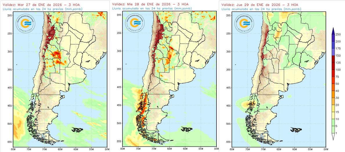 Para los próximos tres días el modelo de precipitaciones acumuladas proyectadas del SMN muestra aportes relevantes en sectores del NOA, Cuyo y parte de San Luis y Córdoba. Pero sigue sin mostrar lluvias copiosas en muchas zonas necesitadas de agua.