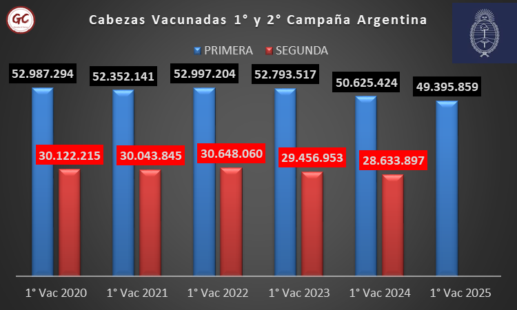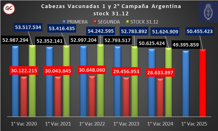 Ahora, en base a la información de la Primera Vacunación del 2025, “lo que vemos es que la tendencia tiende a agudizarse y el stock no se ha recuperado, sino que ahora el diferencial entre la vacunación 2020 y la vacunación 2025 es de 3.6 millones de cabezas”.