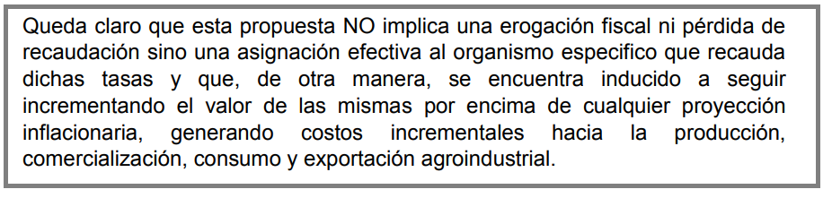 “Queda claro que esta propuesta no implica una erogación fiscal ni pérdida de recaudación, sino una asignación efectiva al organismo especifico que recauda dichas tasas y que, de otra manera, se encuentra inducido a seguir incrementando el valor de las mismas por encima de cualquier proyección inflacionaria, generando costos incrementales hacia la producción, comercialización, consumo y exportación agroindustrial”, apunta la carta.