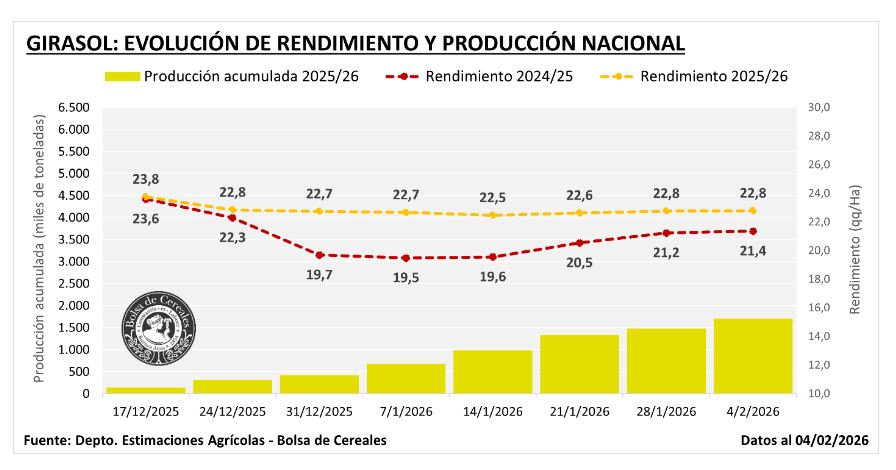 Por último, la proyección de producción de girasol sube 400.000 toneladas y se ubica en 6,2 millones de toneladas para el ciclo 2025/26. El ajuste responde no sólo a los buenos resultados registrados en el NEA, Córdoba y centro-norte de Santa Fe, sino a que luego de las lluvias de las últimas dos semanas las estimaciones de rendimiento esperado en la zona pampeana se incrementaron.