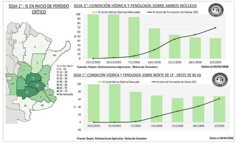 Más del 40% de la soja de primera transita el período de definición de rendimiento sobre el centro del área agrícola nacional con limitantes condiciones hídricas. Las zonas más comprometidas son el centro–este de Entre Ríos, sur de Córdoba y, en menor medida, la zona núcleo pampeana.