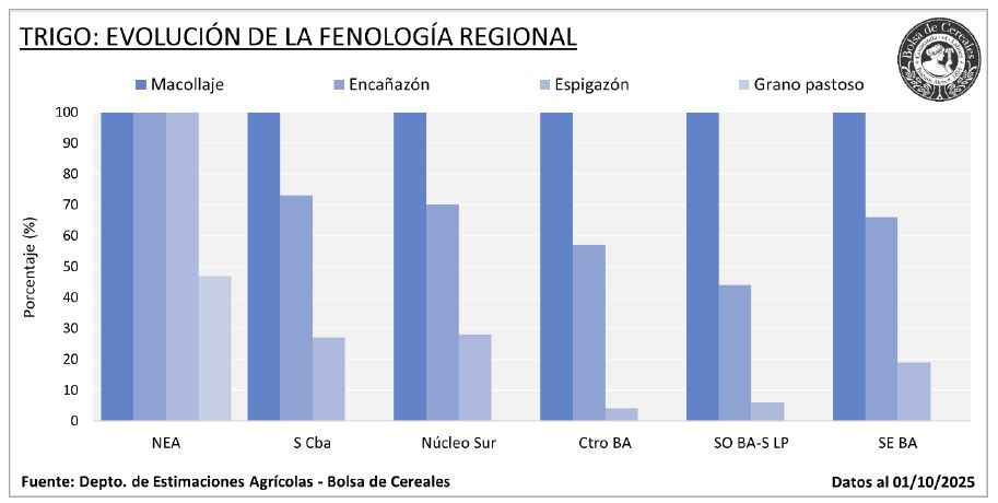 Con el inicio de la cosecha de los primeros lotes de trigo primicia en el NOA, en el NEA casi la mitad de la superficie ya se encuentra en la fase de grano pastoso, mientras que en la zona núcleo pampeana esa proporción aún no supera el 30%.