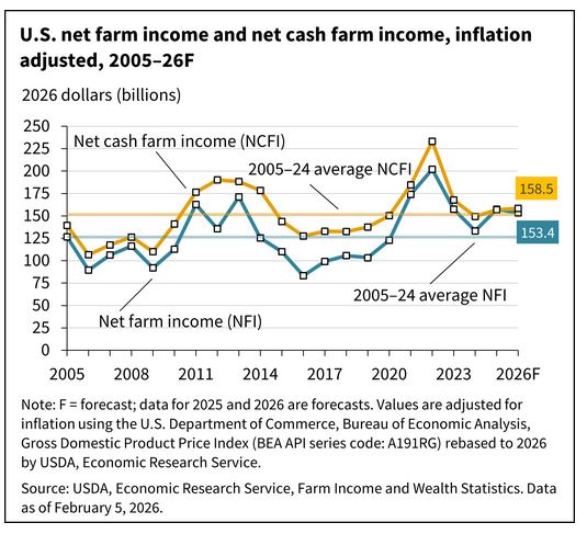 El Servicio de Investigaciones Económicas del Departamento de Agricultura de EE.UU. (ERS-USDA) aumentó la proyección de ingresos de las empresas agropecuarias estadounidenses para 2026 con respecto al año pasado.