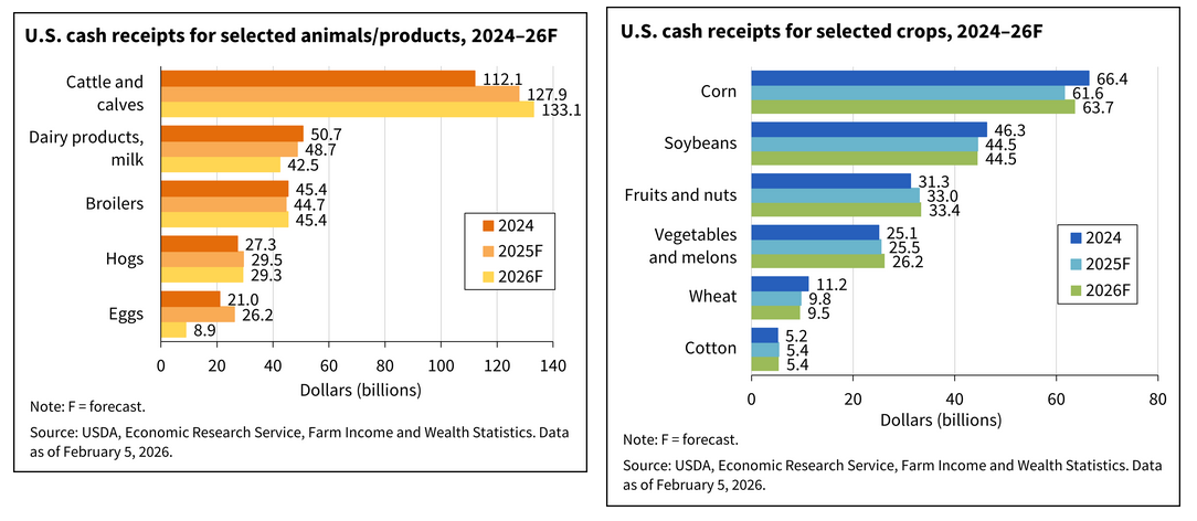 El cálculo del ERS prevé que los ingresos por la venta de productos agrícolas sumen 240.800 millones de dólares en 2026, una cifra real menor a la registrada el año pasado.