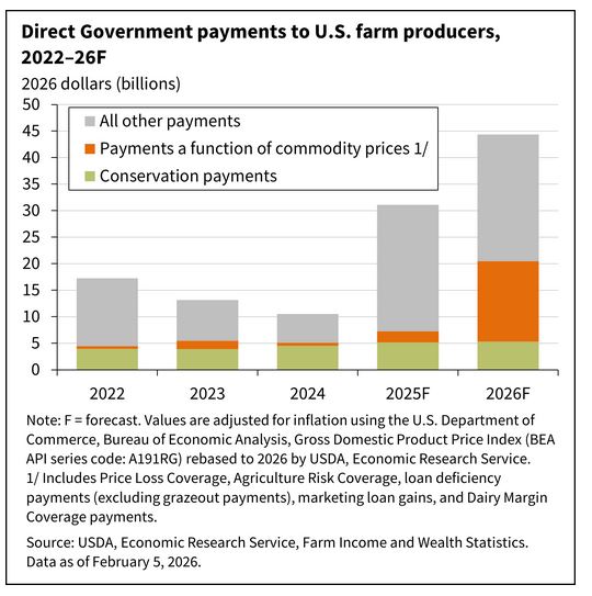 La cuestión es que la mayor parte del crecimiento de los subsidios estatales estimados para el presente año 2026 se explican no por programas de ayuda oficiales del USDA, sino por contribuciones extraordinarias ¡Así cualquiera!