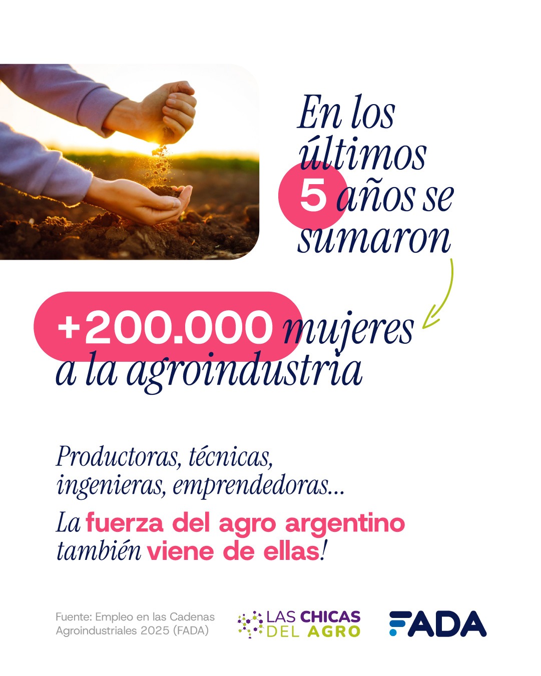 De los 4,2 millones de personas que emplean las cadenas agroalimentarias y sus servicios conexos, 1,2 millones de trabajadores del agro son mujeres, es decir trabajadoras. Lo confirmó un relevamiento realizado por la Fundación Agropecuaria para el Desarrollo de Argentina (FADA) y la Asociación Civil Las Chicas del Agro, que mostró que en los últimos 5 años se sumaron al sector más de 200 mil mujeres, entre productoras, técnicas, ingenieras y emprendedoras.