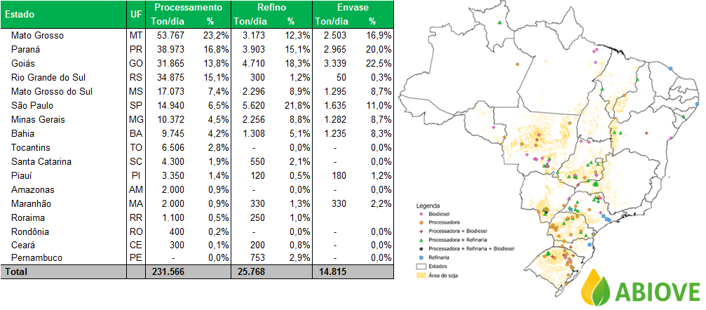 También se registró un aumento del 5,7% en la capacidad total de procesamiento diario, que este año es de 231.566 toneladas/día, la mayor parte de la cual se localiza en Mato Grosso, Paraná, Goiás y Rio Grande do Sul.