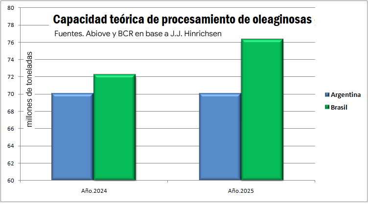 En lo que respecta a la Argentina, el último dato disponible publicado por la Bolsa de Comercio de Rosario en base a  J.J. Hinrichsen, la capacidad instalada este año se mantuvo sin cambios con respecto a 2024 en un volumen total de 70,0 millones de toneladas.