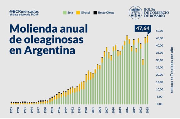 En el año 2025 se procesaron en el Argentina 42,6 millones de toneladas de soja, 4,63 millones de girasol y 380.000 toneladas del resto de oleaginosas. En el caso de la soja, el volumen registrado en 2025 es el segundo más alto de la historia; sólo por detrás de los 44,4 millones de toneladas del año 2016.