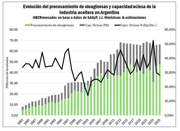 Si se compara el nivel de procesamiento con la estimación de capacidad instalada activa, se puede observar que, con una molienda de 47,6 millones de toneladas de oleaginosas en 2025, se arriba a una capacidad ociosa de la industria estimada en torno al 28,2%, lo cual sería un mínimo desde el año 2011.