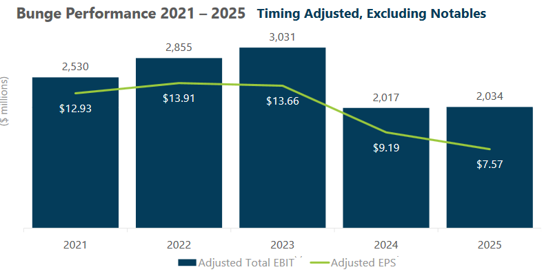 Este miércoles Bunge presentó su balance del ejercicio 2025, donde se advierte en los últimos dos ciclos viene cayendo el EBIT (utilidades antes de intereses e impuestos en inglés), así como también el EPS (beneficio por acción), que mide la parte del beneficio neto total que corresponde a cada acción ordinaria en circulación.