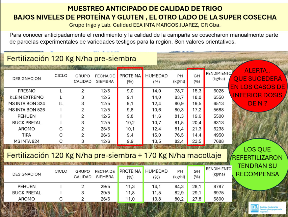 Sin embargo, los resultados en parcelas refertilizadas sí mostraron niveles de proteína y gluten húmedo más cercanos al promedio histórico con rendimientos productivos igual de excepcionales.