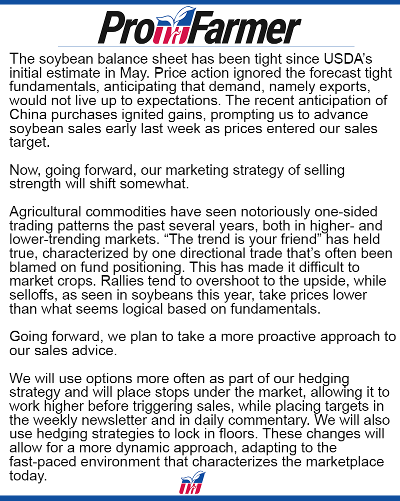 “Además, publicaremos objetivos en el boletín semanal y en los comentarios diarios. También utilizaremos estrategias de cobertura para fijar precios mínimos. Estos cambios permitirán un enfoque más dinámico, adaptándonos al entorno acelerado que caracteriza al mercado actual”, resumió Pro Farmer.