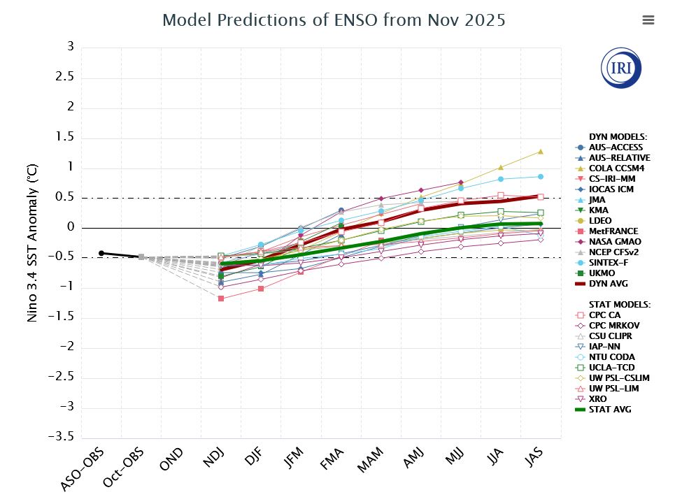 Por otra parte, por el momento el promedio de pronósticos climáticos prevé la finalización de la fase “La Niña” para el otoño 2026, la cual sería reemplazada por un período ENSO “Neutro”, que se extendería durante lo que queda del año que viene.