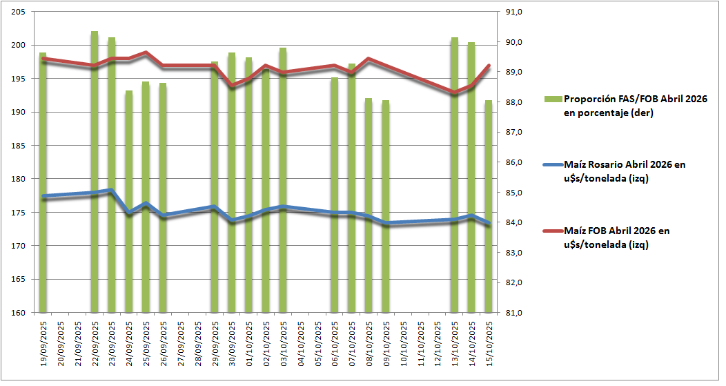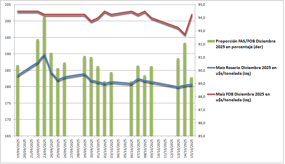 En la jornada inmediata anterior a la implementación del régimen de suspensión temporaria de derechos de exportación el precio promedio negociado por el contrato Maíz Rosario Diciembre 2025 en el mercado A3 representó el 90,4% del valor FOB oficial para esa posición, lo que implica que, en los hechos, el cereal ya estaba libre de retenciones.
