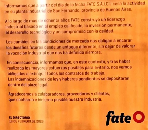 “FATE construyó un liderazgo industrial basado en el empleo calificado, la inversión permanente, el desarrollo tecnológico y un compromiso con la calidad. Los cambios en las condiciones de mercado nos obligan a encarar los desafíos futuros desde un enfoque diferente. En consecuencia, informamos que, en este contexto, y tras haber realizado los mayores esfuerzos posibles para evitarlo, nos vemos obligados a extinguir todos los contratos de trabajo. Las indemnizaciones de ley y haberes pendientes se depositaran dentro del plazo legal”, reza a continuación el mensaje, que generó gran impacto en el inicio de esa semana.
