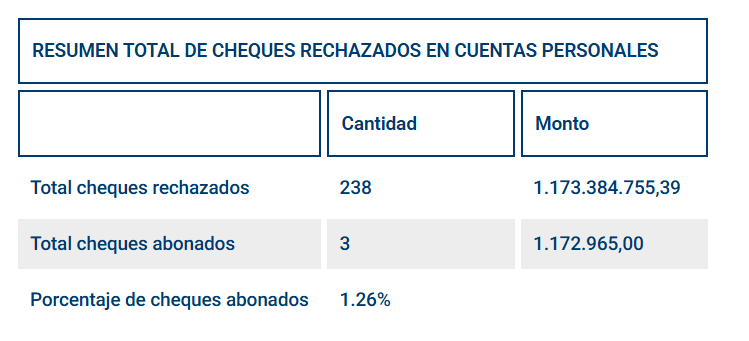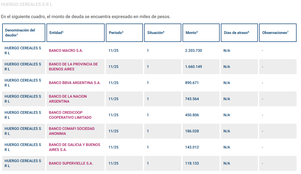 De acuerdo con los registros oficiales del Banco Central de la República Argentina, Huergo Cereales S.R.L. registra un total de 238 cheques rechazados, por un monto acumulado de 1.173 millones de pesos. A su vez, la empresa mantiene deudas con entidades financieras que superarían los 6.000 millones de pesos, aunque al momento de la última actualización figura en situación crediticia 1, es decir, “normal”, según la clasificación del organismo monetario.