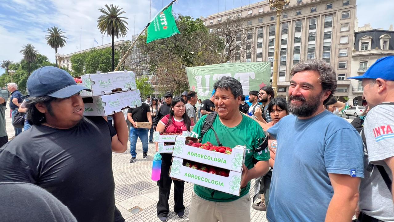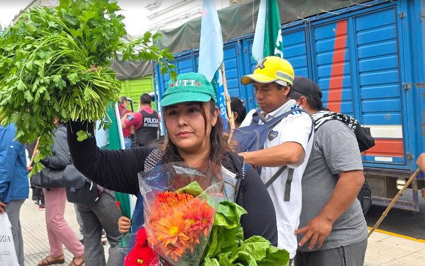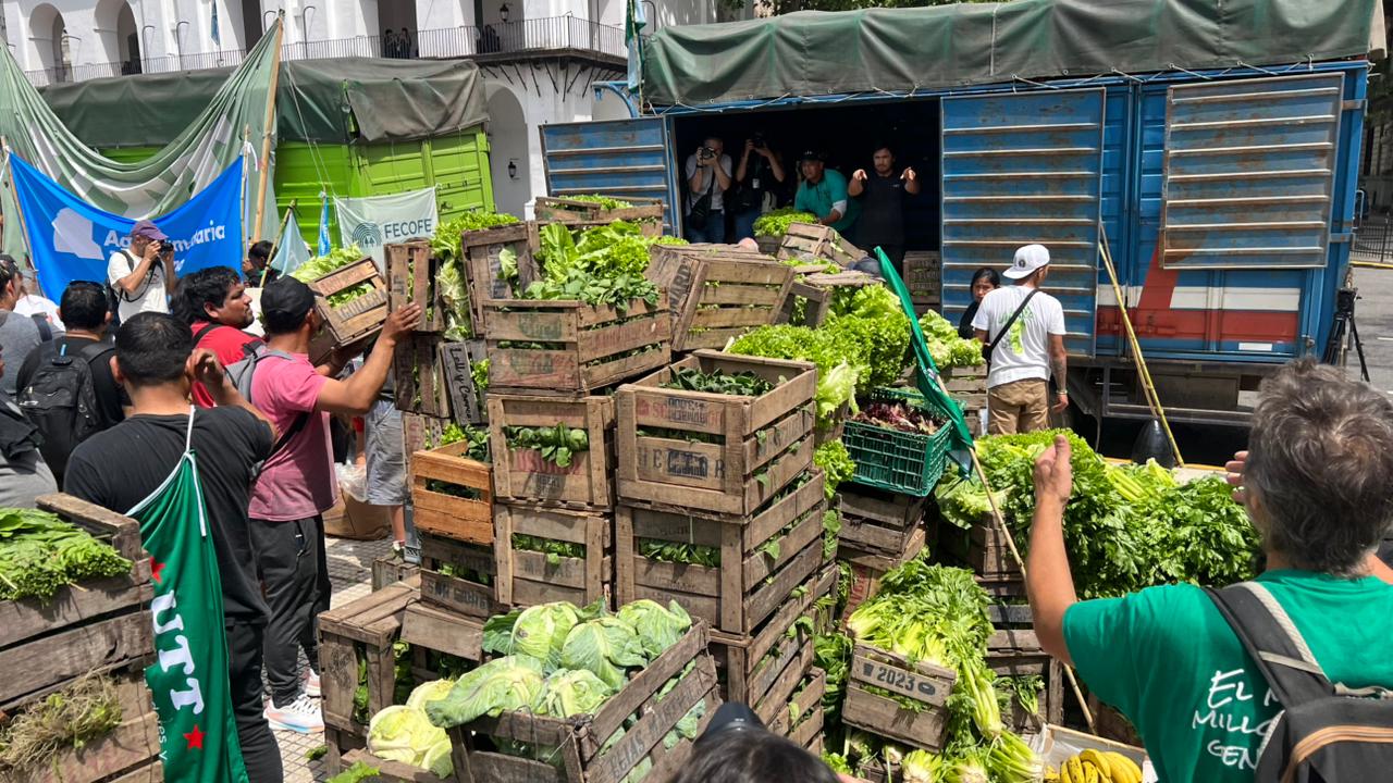 La postal, que no fue nueva para el microcentro porteño, contó con la presencia de referentes de distintas economías regionales que distribuyeron entre decenas de vecinos unos 20.000 kilos de productos, como hortalizas, bananas, frutillas, yerba mate, huevos y hasta leche en polvo.