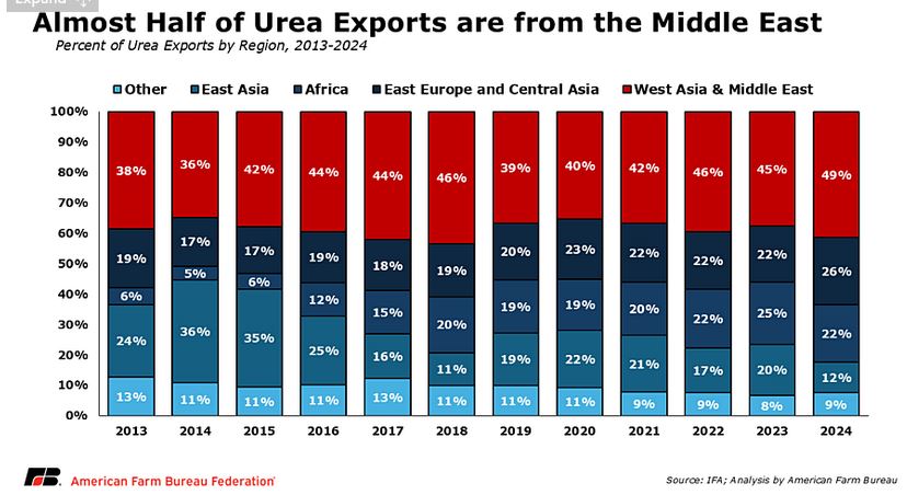 Oriente Medio es un importante centro de producción y exportación de fertilizantes nitrogenados. Los países expuestos a perturbaciones en la región por la guerra representan casi el 49% de las exportaciones mundiales de urea y alrededor del 30% de las exportaciones mundiales de amoníaco, lo que refleja la concentración de la producción y la capacidad de exportación de fertilizantes en el Golfo Pérsico y sus alrededores. Entre los principales exportadores se encuentran Irán, Qatar, Arabia Saudita y Egipto.