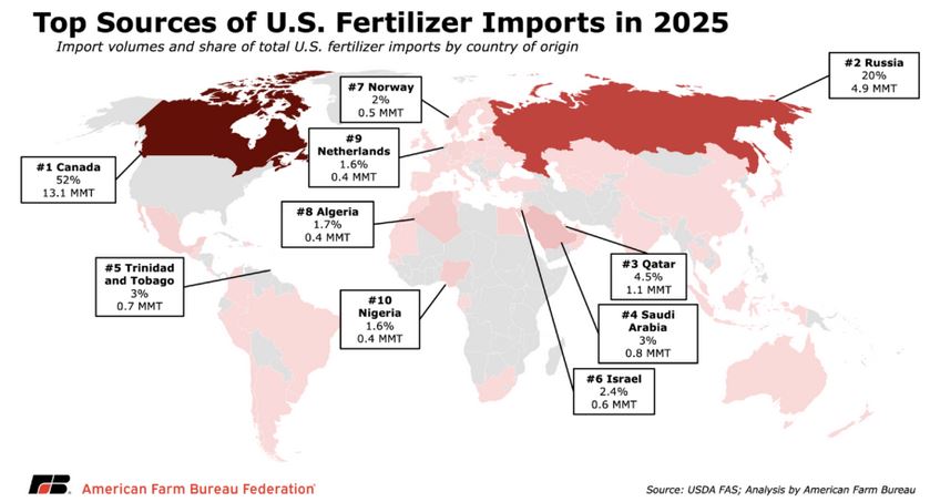 . Si los productores estadounidenses no pueden obtener los suministros restantes de fertilizantes a tiempo, podríamos ver reducciones o cambios en la superficie cultivada y menores rendimientos, lo que afecta la seguridad alimentaria de nuestro país y la disponibilidad de productos esenciales”, alertó AFBF.
