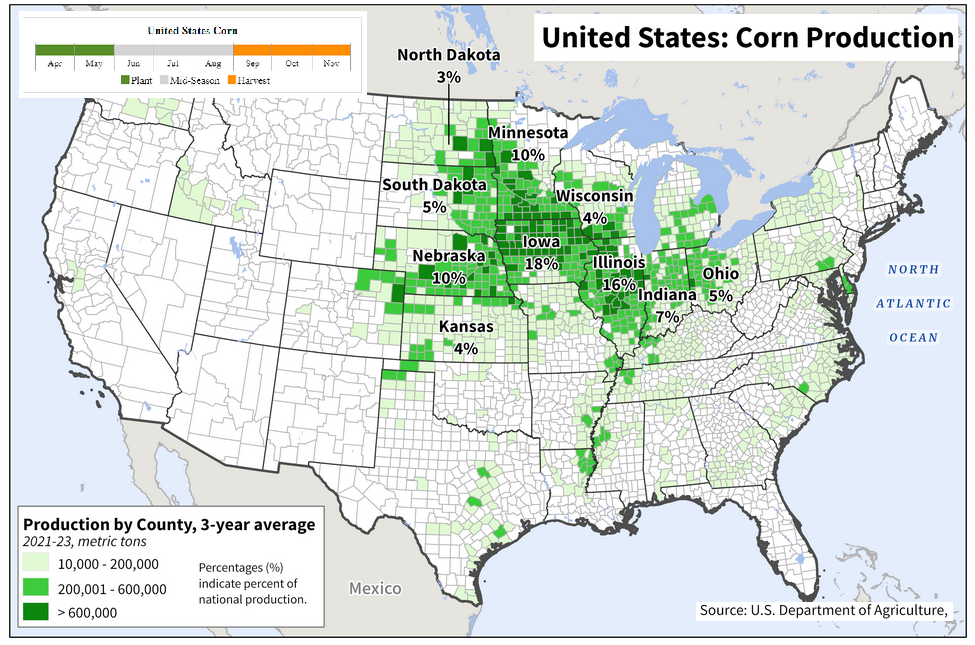 En el “cinturón maicero” de EE.UU, que incluye los estados de Iowa, Illinois, Indiana, Ohio y Nebraska, la siembra de maíz generalmente comienza a finales de abril y termina a mediados de mayo, seguida de la siembra de soja poco después.