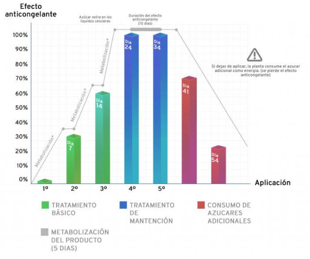 Para lograr el efecto anticongelante sistémico en todo el tejido vegetal, se requieren 3 aplicaciones (1 por semana, como mínimo, tratamiento básico o inicial). Este efecto dura 10 días, ya que posteriormente el 34% adicional de azúcar en los tejidos es consumido metabólicamente por parte de la planta. Por esto, se recomienda continuar aplicándolo desde la 4ta aplicación cada 10 días (tratamiento de mantención), hasta finalizar el riesgo de heladas.