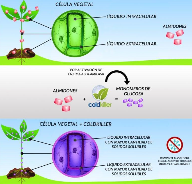 El contenido de una especie vegetal es entre 80 y 90% de agua, la cual se congela en condiciones de helada. ColdKiller® es un producto líquido que aumenta la resistencia de los tejidos vegetales para soportar fríos extremos. Transforma los almidones, que son grandes moléculas de azúcar, en monómeros de glucosa, que son pequeñas moléculas de azúcar, para aumentar la densidad del contenido acuoso. Así, disminuye su punto de congelación, retardando la congelación ante fríos extremos.