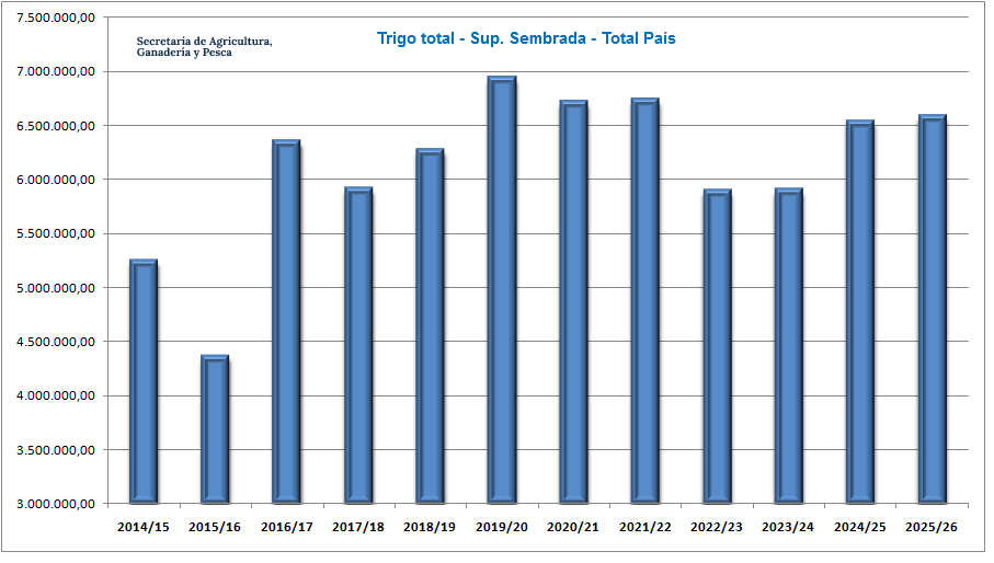 Este año se sembraron, según datos oficiales, 6,60 millones de hectáreas de trigo en la Argentina versus 6,55 millones en 2024, pero en 2019 esa cifra había sido de 6,95 millones.