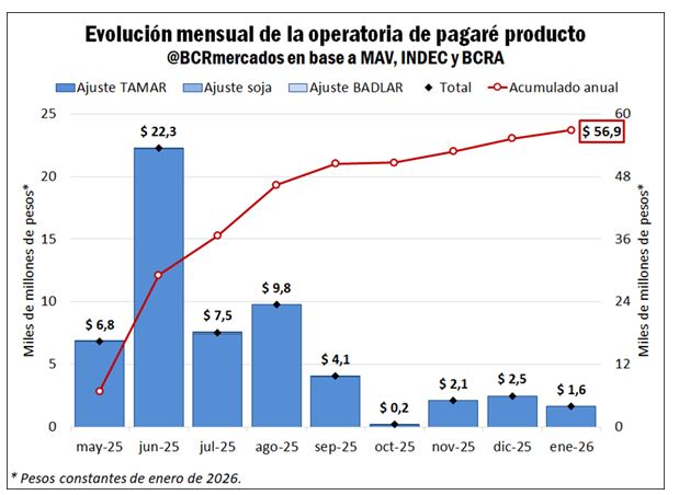 Desde mayo de 2025 hasta enero de 2026 las operaciones de pagaré producto en el Mercado de Valores (MAV) totalizaron 56.900 millones de pesos (valor medido en pesos constantes de enero de 2026)