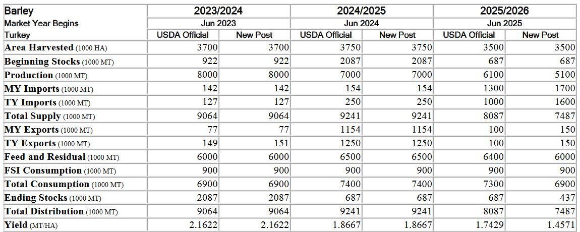 Según un informe de la oficina del USDA en Turquía, la cosecha de trigo habría sido de 16,3 millones de toneladas versus una cifra inicial proyectada de 19,0 millones (parte del cereal se emplea con fines forrajeros), mientras que la producción de cebada forrajera en esa nación fue de apenas 5,1 millones contra una expectativa inicial de 6,1 millones.