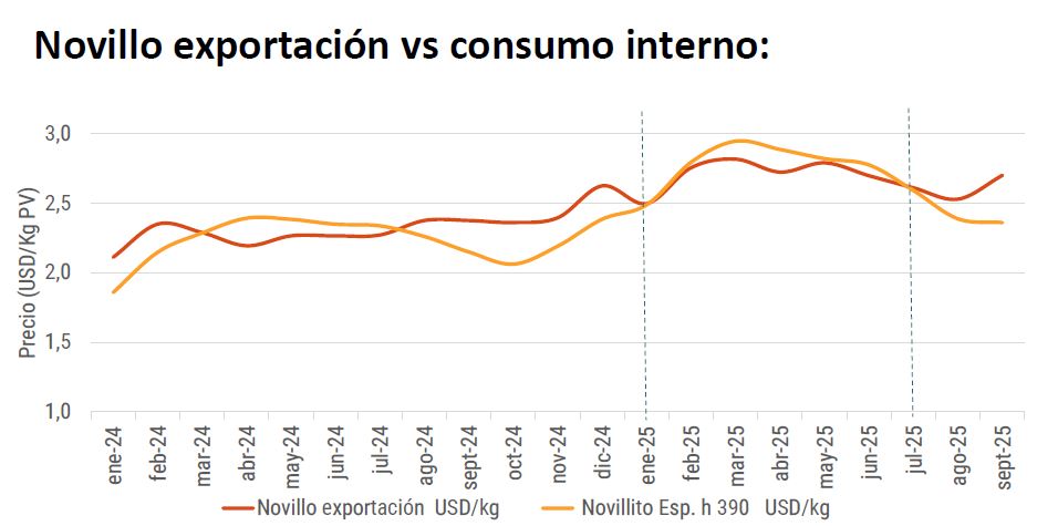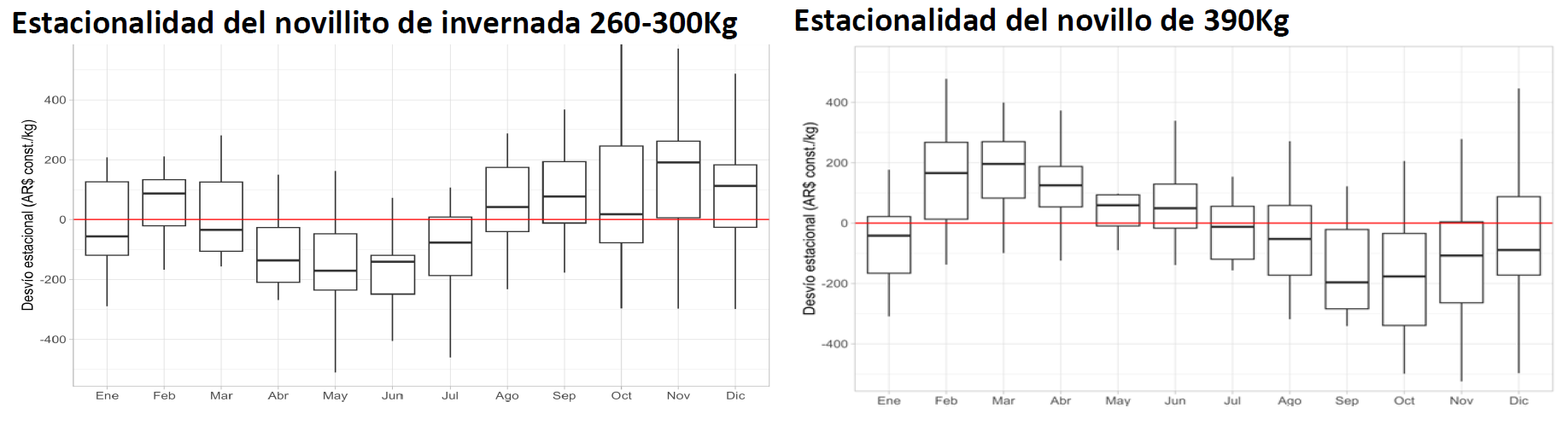 En términos estacionales, considerando la serie de precios de 2010 a la fecha, en el último trimestre del año suelen presentarse ajustes al alza de los valores de los novillitos de invernada, mientras que la dinámica inversa ocurre con el novillo tanto liviano como pesado.