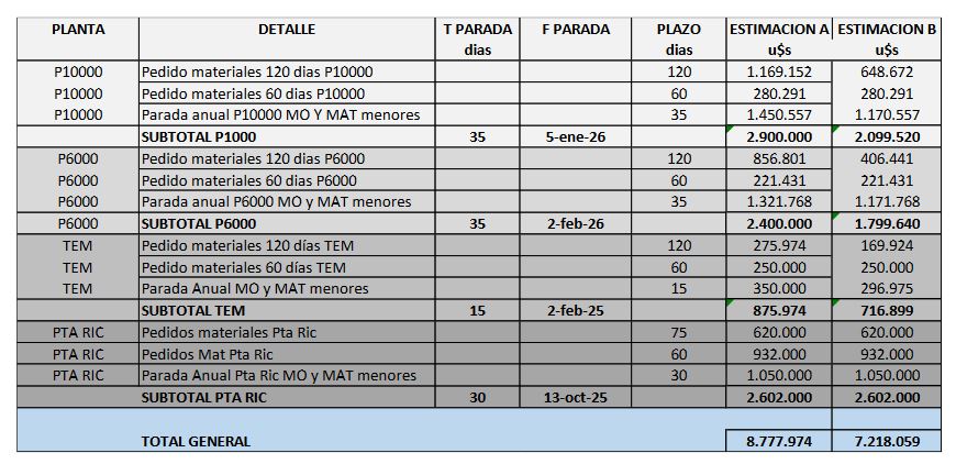 La parada técnica de la planta San Lorenzo se prevé ejecutar en enero próximo para la línea de procesamiento de 10.000 toneladas diarias de soja, mientras que la línea de 6000 toneladas diarias realizará una parada técnica a mediados de febrero de 2026.