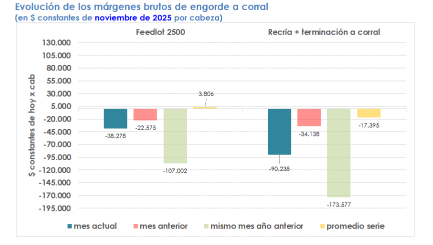 En contraste a esta situación favorable, el documento mostraba -con datos a noviembre pasado- la delicada situación del feedlot, con márgenes brutos negativos.