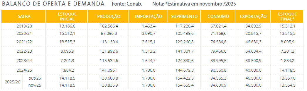 Para la cosecha de maíz 2024/25, Conab estima una producción total de 141,1 millones de toneladas de maíz, lo que marcaría un récord histórico para el país. En cuanto a la estimación preliminar para el ciclo 2025/25, la cifra publicada por Conab es de 138,6 millones de toneladas considerando una situación climática normal.
