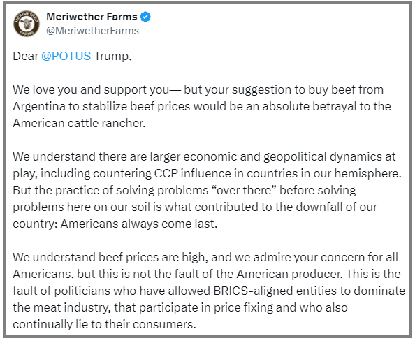 Una empresa ganadera estadounidense con sede en el estado de Wyoming, Meriwether Farms, publicó en redes sociales una carta destinada Trump en la cual asegura que ampliar el cupo de exportación de la Argentina “sería una absoluta traición al ganadero estadounidense” porque “es uno de los últimos símbolos de independencia que tenemos en la nación”, por lo que “la continua manipulación y traición por parte de quienes dicen apoyarlo debe cesar de inmediato”.