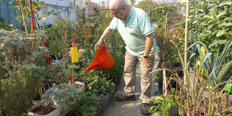 La terraza de Carlos no parece una terraza: parece un pequeño oasis productivo. Allí conviven verduras, aromáticas, frutales y flores en una densidad que sorprende. Él es el creador de Huerta Orgánica, un proyecto que enseña a cultivar tanto en espacios reducidos como en el suelo. Su mensaje es claro: se puede producir alimento propio en la ciudad.
