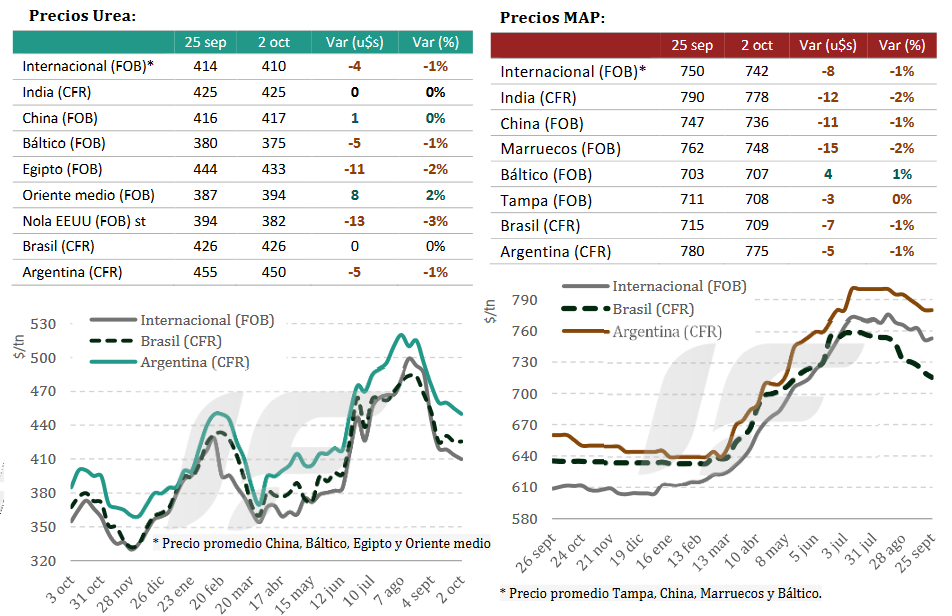 Por el lado de la urea, los precios internacionales seguían con su tendencia bajista hasta que a fines de esta semana India anunció una nueva licitación para comprar 2,0 millones de toneladas con fecha de cierre del próximo 15 de octubre. Eso provocó que se detuviera el proceso bajista.