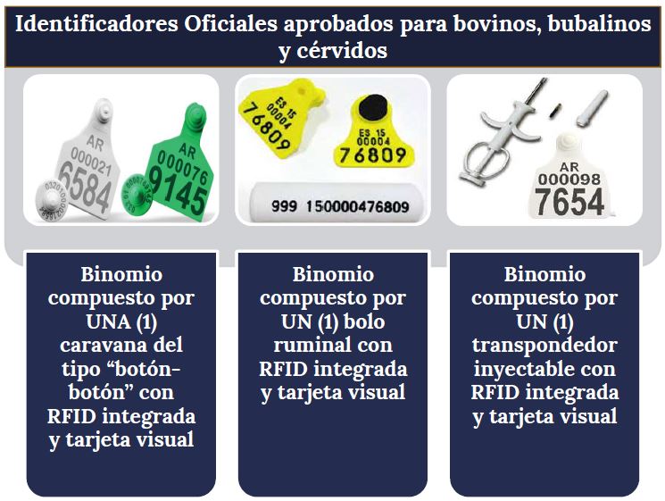 Los bovinos y bubalinos de pedigrí, puros controlados, puros registrados, del registro de crías y otras denominaciones equivalentes deben ser identificados con un binomio compuesto por una tarjeta visual en la oreja izquierda, cuyas características –indica la resolución– “serán elegidas por estas entidades y que, como mínimo, contengan el código de identificación individual del animal [Registro Particular (RP)] y un dispositivo electrónico –botón RFID, bolo RFID o bien transpondedor inyectable– en la oreja derecha”.