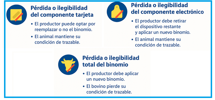 Ante la pérdida o la ilegibilidad del componente tarjeta, es decir, que el bovino, bubalino o cérvido mantenga solo el componente con RFID, podrá reemplazarlo o no por otro binomio (tarjeta y botón RFID, bolo RFID o transpondedor inyectable). En ambas situaciones el animal mantiene su condición de trazable.