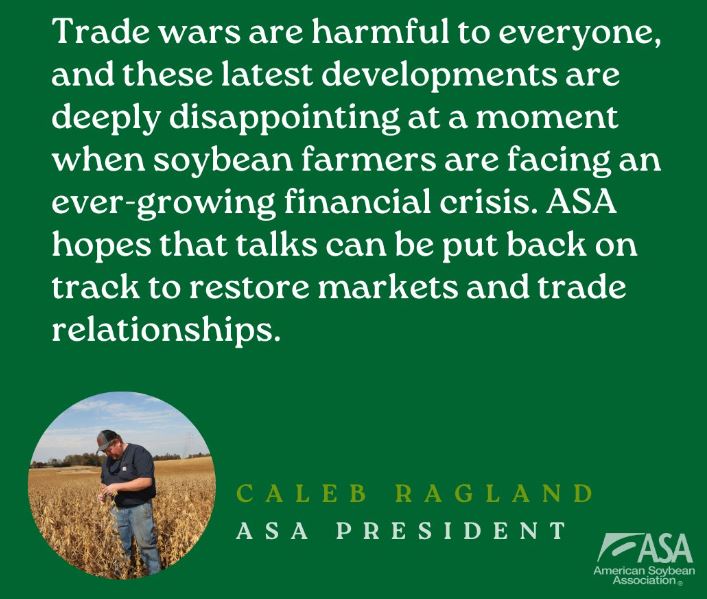 “Las guerras comerciales son perjudiciales para todos y estos últimos acontecimientos son profundamente decepcionantes en un momento en que los productores de soja se enfrentan a una crisis financiera cada vez mayor. La ASA espera que se puedan reanudar las conversaciones para restablecer los mercados y las relaciones comerciales”, añadió.