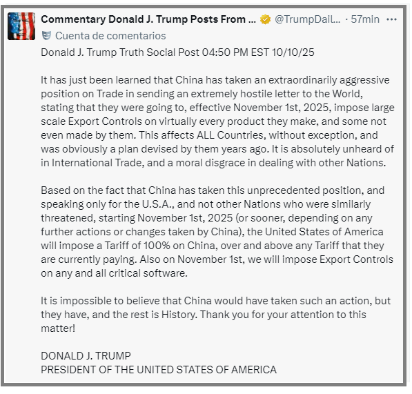 El presidente de EE.UU. Donald Trump afirmó este viernes que “ya no considera necesaria” una reunión con el presidente chino Xi Jinping y anunció que aplicará un nuevo arancel adicional del 100% a China del 100% sobre los aranceles actualmente vigentes, lo que implicaría un bloqueo comercial total.