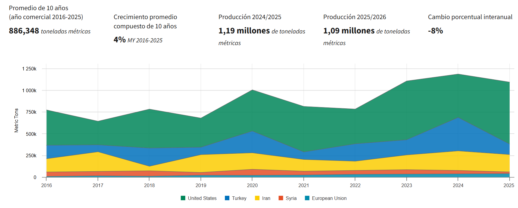 Este auge productivo se reflejó de inmediato en el comercio. Las exportaciones alcanzaron las 644 mil toneladas, otro récord, especialmente por “el fuerte impulso exportador de Irán y el mayor dinamismo de Turquía y Siria”, todos países que ahora estarán en duda por estar en epicentro del conflicto.