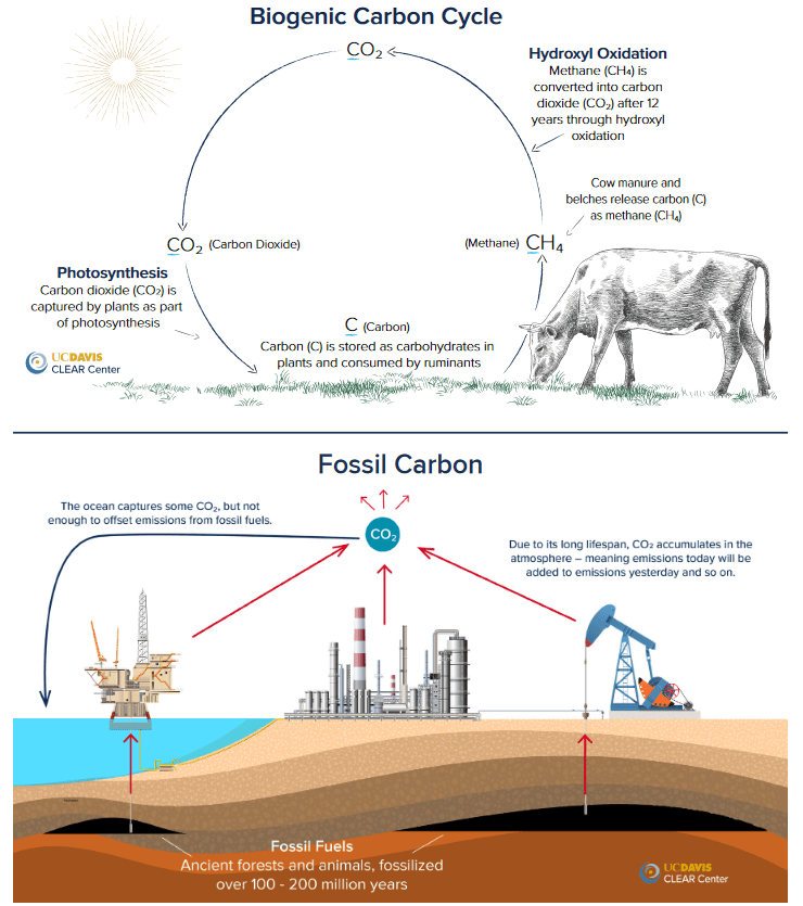 Sin embargo, existe evidencia científica que indica que el metano generado por bovinos no puede ser considerado como un gas de efecto invernadero en términos equivalentes al dióxido de carbono porque forma parte de un ciclo natural y además es de corta duración, ya que permanece en la atmósfera durante aproximadamente diez a doce años antes de que se descomponga y se elimine.